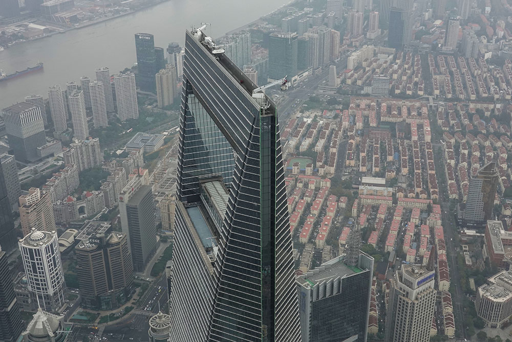 Von oben, im 118. Stockwerk, hat man natürlich einen tollen Blick auf die Stadt. Eindrucksvoll auch, wenn man dann auf die anderen Hochhäuser herunter schauen kann. Dass muss den Chinesen erst mal einer nachmachen. Das Ding wurde hochgezogen mit 5 Metern pro Tag.