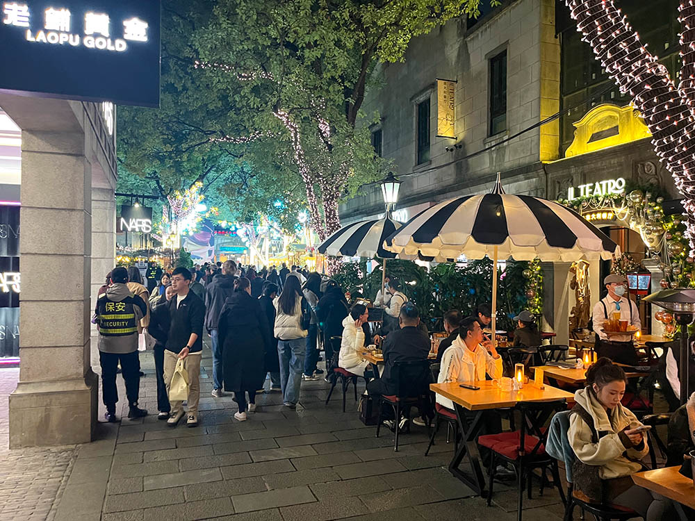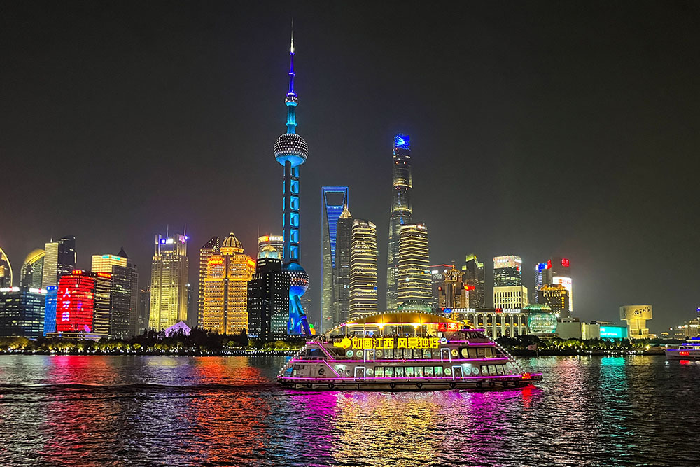 Nach einem Abstecher zur Uferpromenade „Bund“ haben wir drei Stunden Freizeit. Sylke macht ein Schläfchen, Uwe schaut mal in den „Spielzeugladen“ ums Eck: Da gibt es tatsächlich guten Wein zu „normalen“ Preisen. Danach laufen wir zur Shoppingmall ohne zu shoppen (alles viel zu teuer) und sind rechtzeitig zu den nächsten Attraktionen: Abendessen und Lichterfahrt wieder im Hotel. Das Essen war entspannt, aber dann gabs den Ausflug durchs beleuchtete Shanghai mit mehreren Fotostops. Zuerst am Fernsehturm, dann am Bund, dann im französischen Viertel.