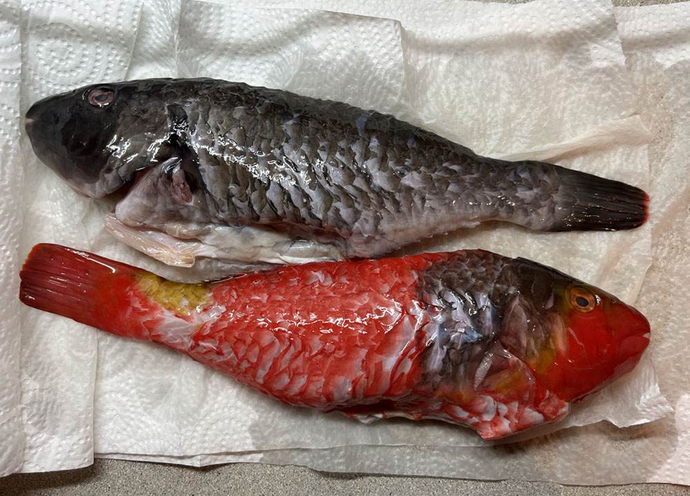 …wir dann abends eine Spezialität der Insel ausprobiert haben: Papageienfisch. War aber nicht so unser Ding.