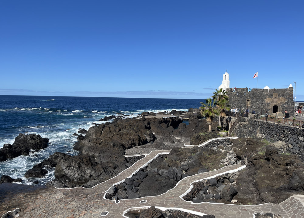 Das Dörfchen Garachico ist sehr nett. Allerdings hat es einiges hinter sich, denn 1706 wurde es durch einen Vulkanausbruch, der riesige Lavaströme zu Tal sandte, dem Erdboden gleich gemacht. Bis auf das kleine Castillo im Bild rechts. Die Wege im Vordergrund gehören zum Naturpool des Dorfes, das übrigens ganz offiziell zu den „schönsten Orten Spaniens“ gehört.