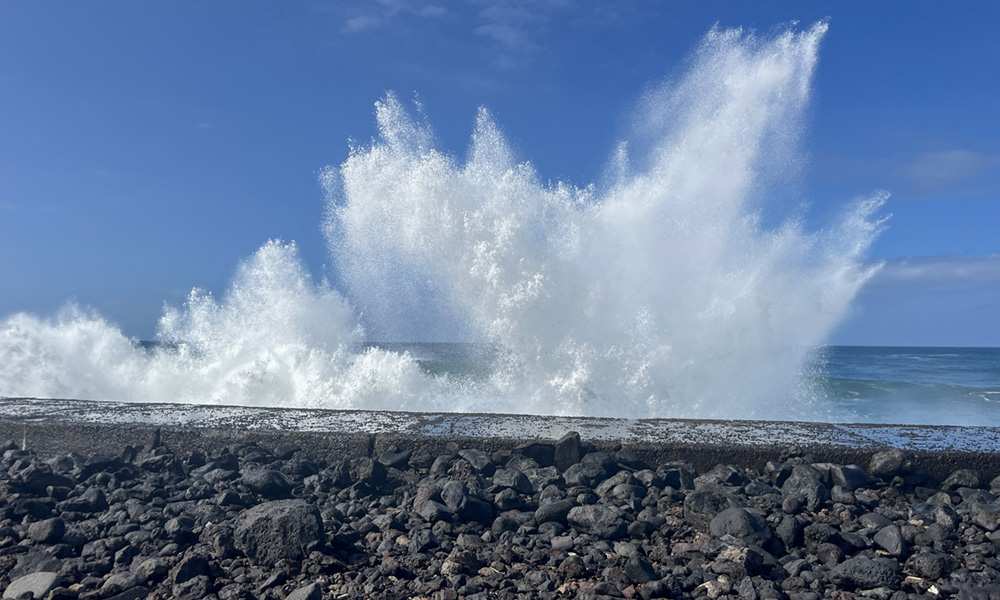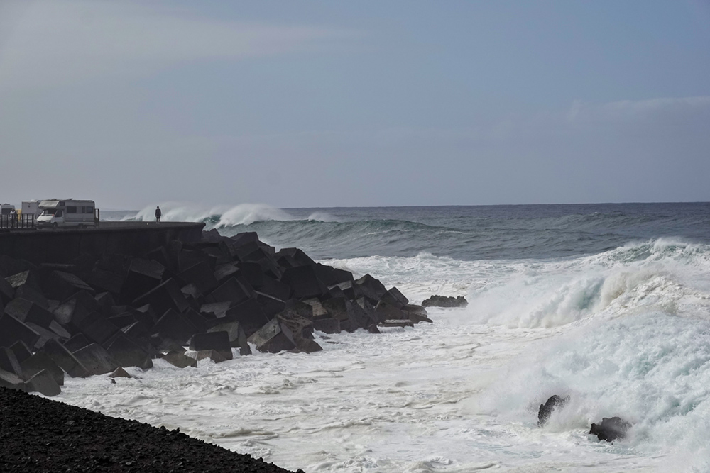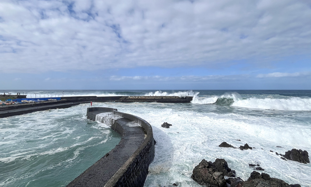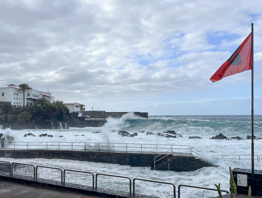 Riesiger Parkplatz, das ist schon mal praktisch. Monsterwellen heute. Dann sind wir ein Stück auf der Mole langspaziert und haben gelacht, wenn die Wellen auch hier die Leute ein bisschen nass gemacht haben. Während Uwe seiner Leidenschaft „Ich fotografiere die tollste Welle“ nachgegangen ist, habe ich ein bisschen gegoogelt. War da nicht vor Kurzem ein tragisches Unglück, wo Leute auf Teneriffa ins Meer gespült wurden und ertrunken sind? Ich sage nur: Unser Rückweg war dann durch die Stadt und nicht auf der gefährlichen Mole! Der Unfall war genau hier in Puerto de la Cruz (okay, die genaue Stelle an der Hafenmole war jetzt mit einem festen Gitter versperrt), aber wir waren irgendwie trotzdem ziemlich nah dran. Und ziemlich doof! Und irgendwie auch ziemlich unreflektiert! Naja, wir leben noch.