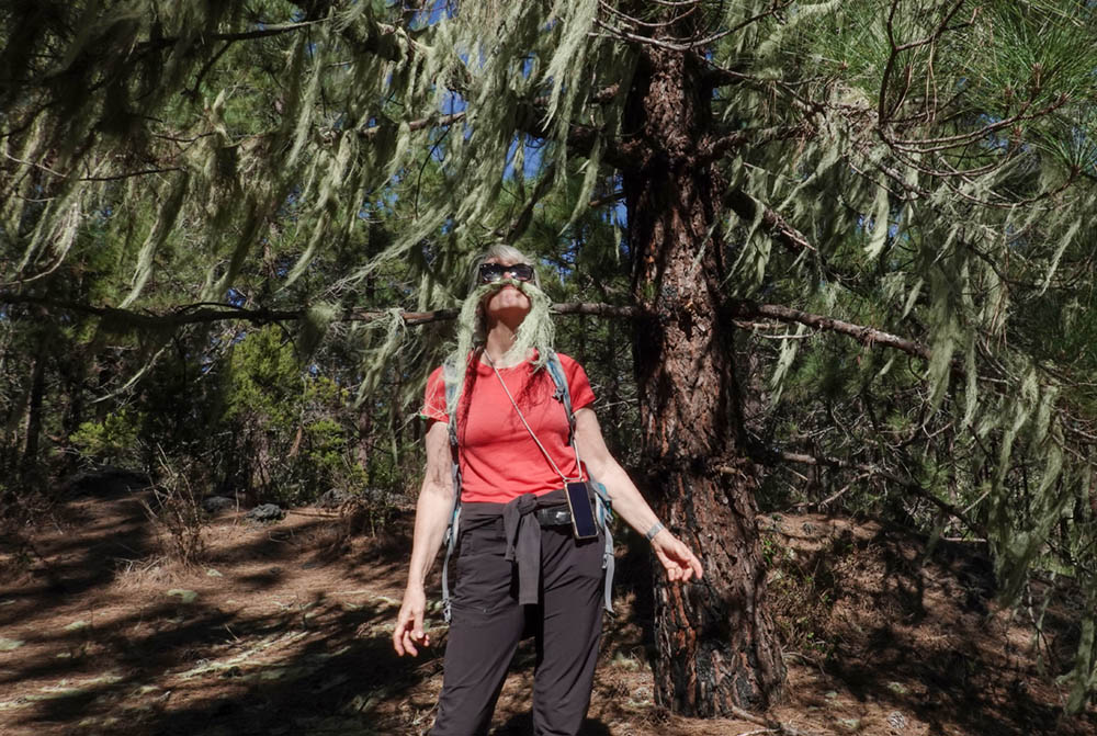 Dieser Wurzelsepp tut nur so. Es ist eigentlich Sylke (wer hätte es erkannt) mit einem Flechtenbart. Die gab es wieder zuhauf an den Bäumen.