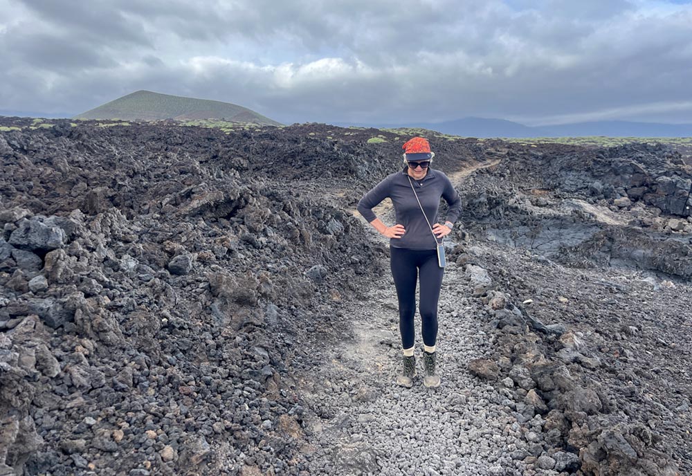 Die Lavafelder haben sich auch nicht verändert, nur Sylke hat ein bisschen geschwächelt trotz Sportklamotten. Allerdings sind wir auch wieder genau dahin gefahren, wo die Wolken waren. Ein gewisser Gewöhnungs-Drang zu schlechtem Wetter lässt sich bei uns nicht verleugnen.