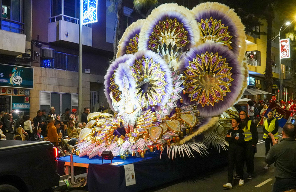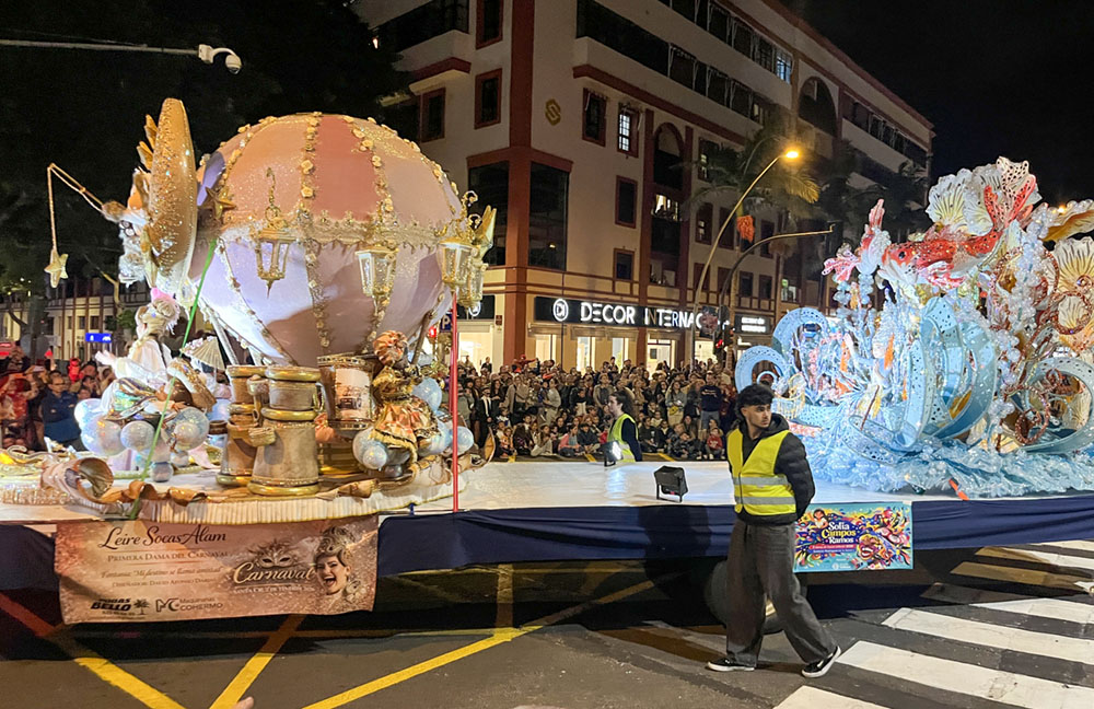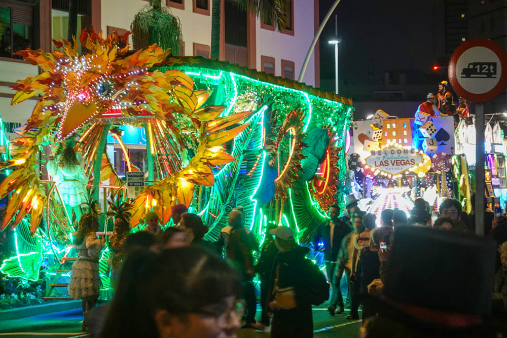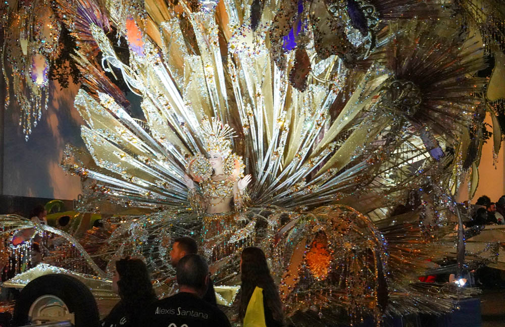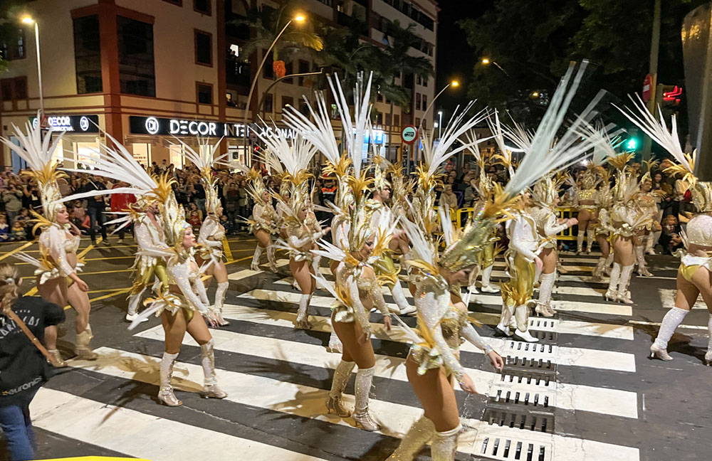 Nanu, die Sonne scheint, der Himmel ist strahlend blau und wir sitzen faul auf unserer Terrasse? Was stimmt da nicht? Ganz einfach: Wir haben Sturm. Und zwar so viel Wind, dass es uns außerhalb des Windschattens fast wegbläst. In Böen bis zu 65 km/h. Das Meer vor unserer Hütte hat 4 Meter hohe Wellen und weiße Schaumkronen. Die Gischt bei den Felsen am Leuchtturm spritzt über 10 Meter hoch. Also bleiben wir brav auf unserer Terrasse und genießen den Valentinstag in der Sonne. Nicht ganz. Zum Essen waren wir heute Mittag zur Feier des Tages im Fischrestaurant in Tajao und gestern Abend ging für Sylke der Wunsch aller Wünsche in Erfüllung: Wir haben den Karnevalsumzug (nach Rio de Janeiro angeblich der größte der Welt) in Santa Cruz besucht.